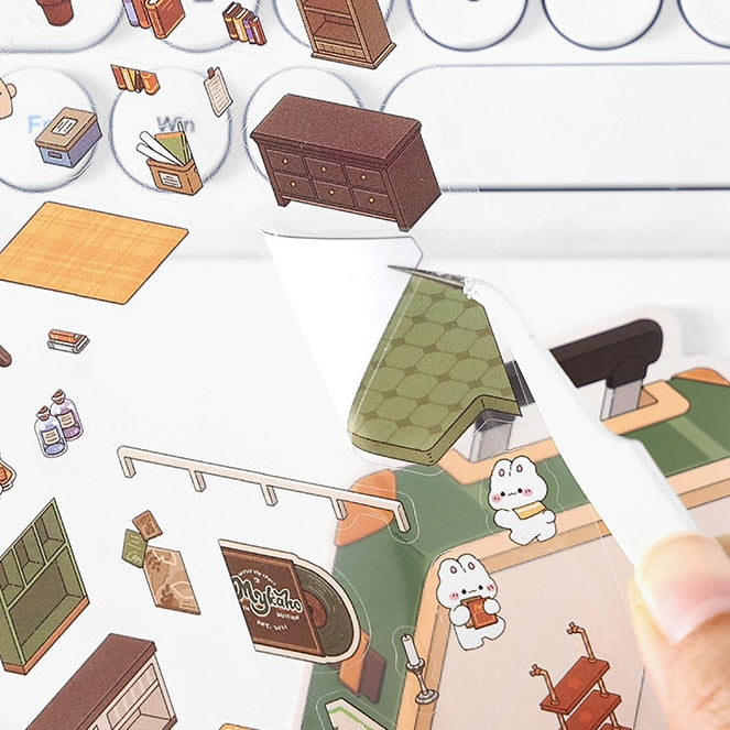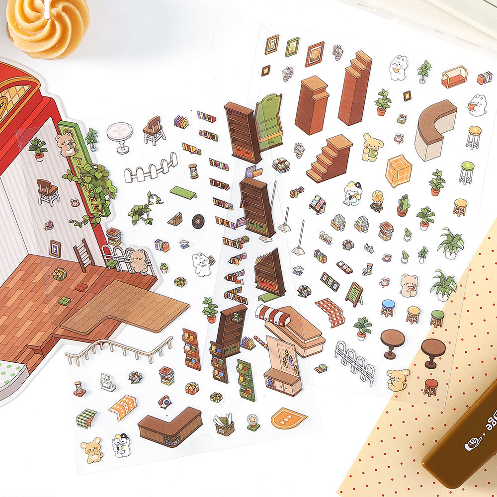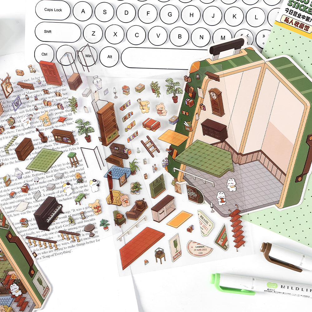Bring tiny worlds to life with this intricate DIY craft set. This pack features four complete 3D scene builds: a two-story boutique shop in a vintage suitcase, a bustling coffee house, a camping van adventure, and a charming gift house set within a classic red post office, all populated by adorable animal characters. It is the perfect creative activity for kids and adults alike. All pieces come pre-cut for a fun and easy assembly experience.