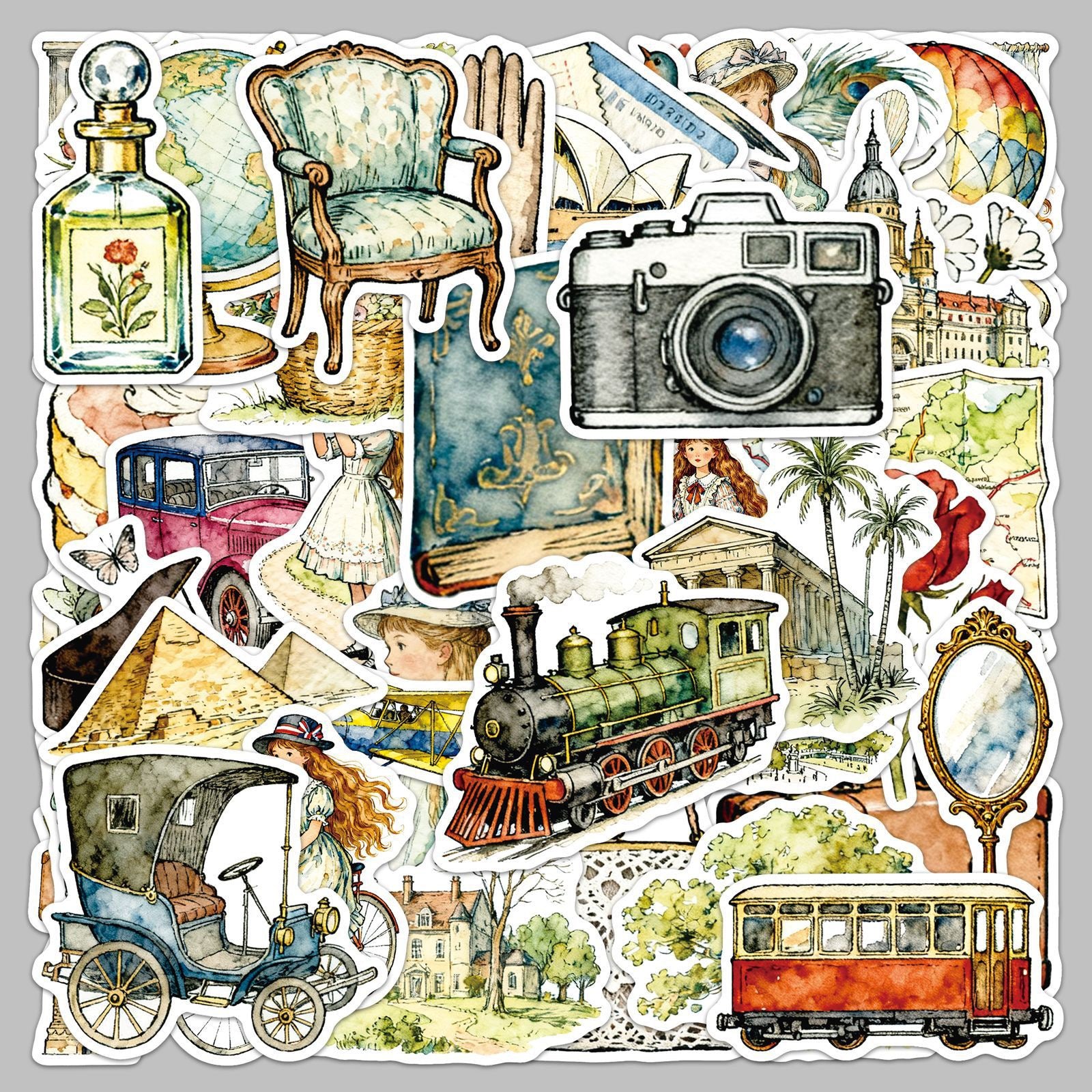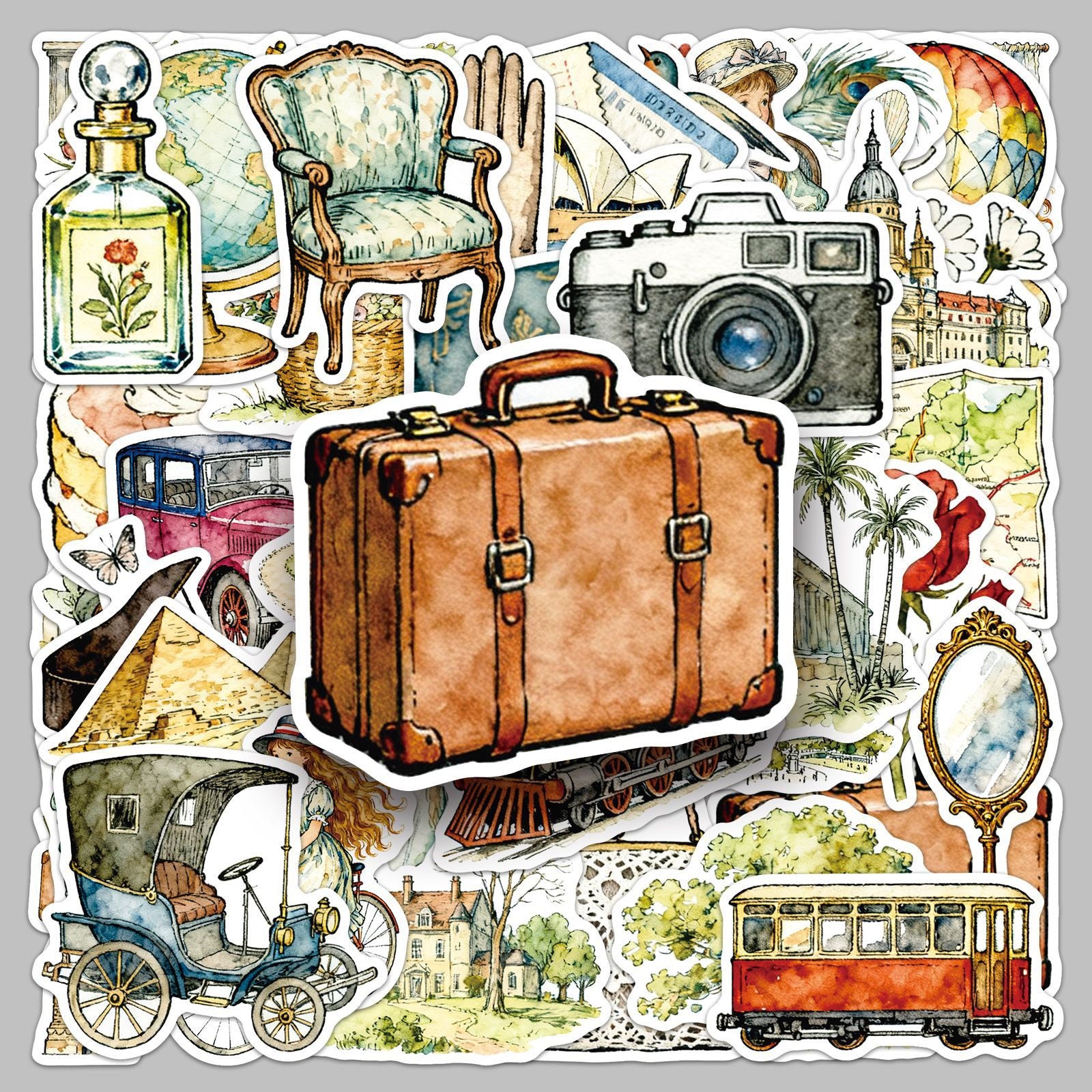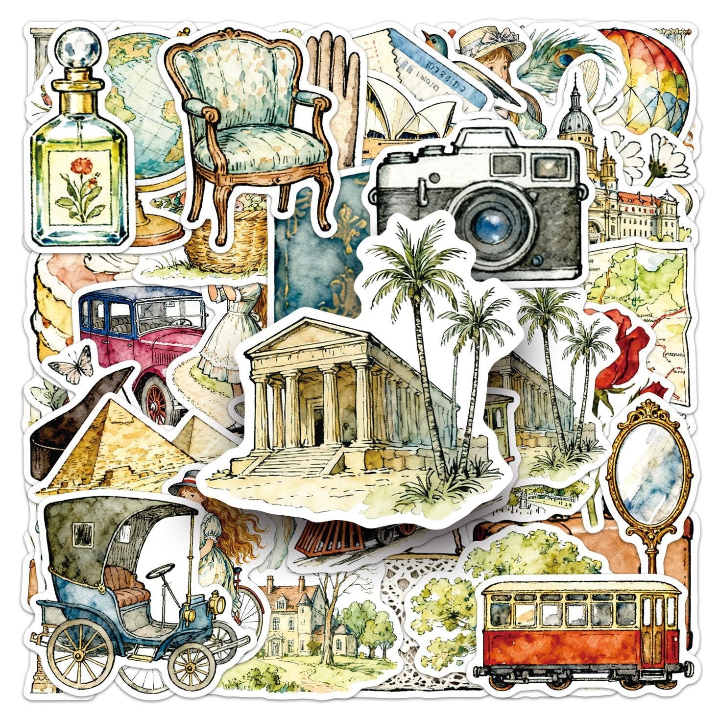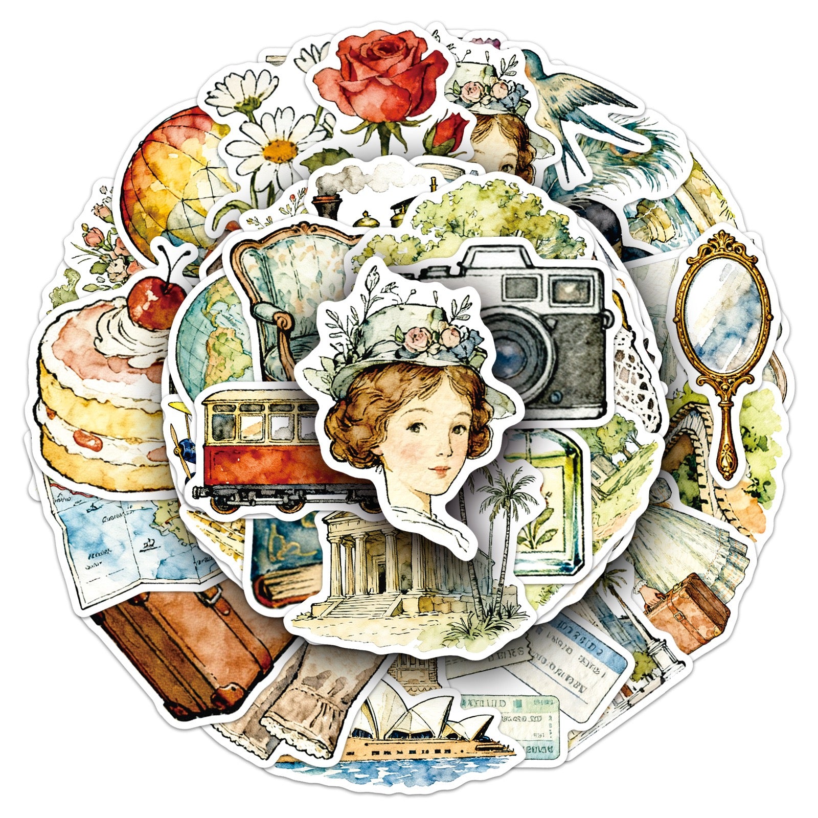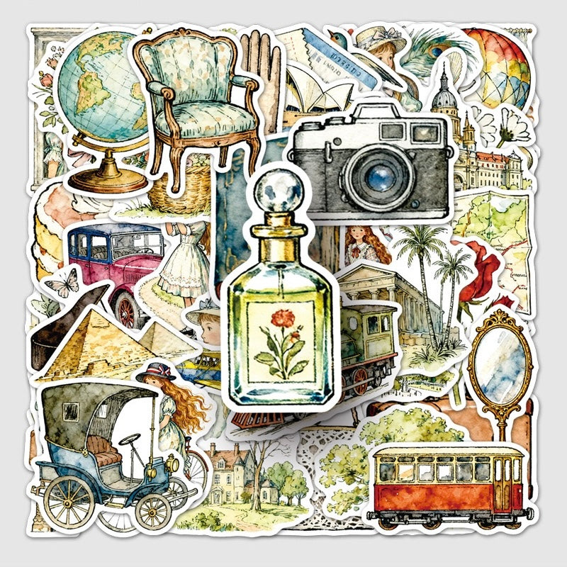 Bring a touch of old-world charm to your crafts with these hand-sketched, watercolor-style stickers. This curated set features 50 unique travel and botanical designs, from iconic landmarks to delicate Victorian lace.