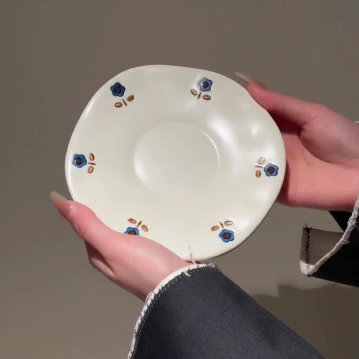 This delicate mug and saucer set features a soft, irregular shape and tiny blue flower details that make every sip feel cozy and special.